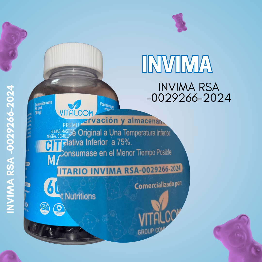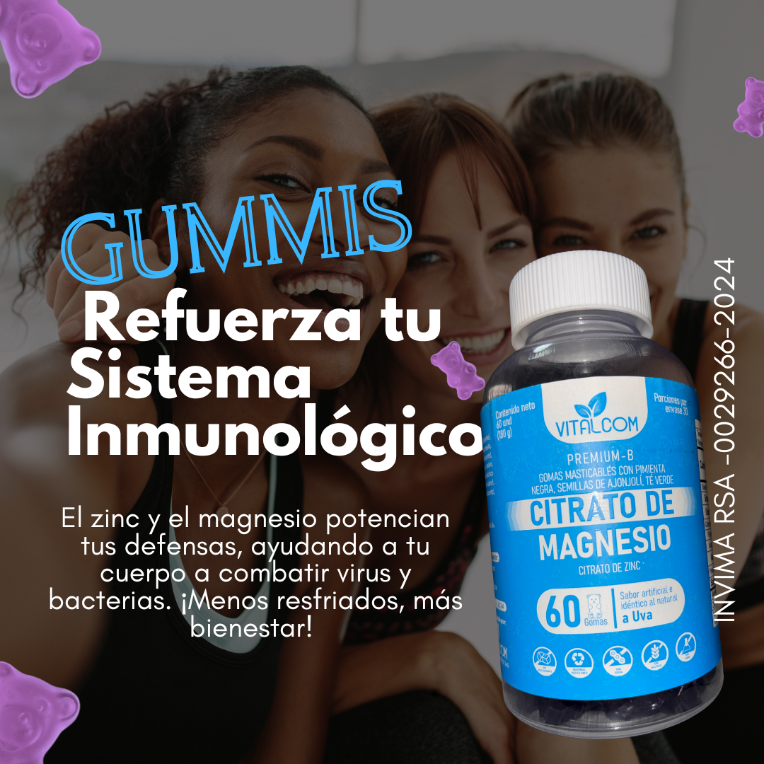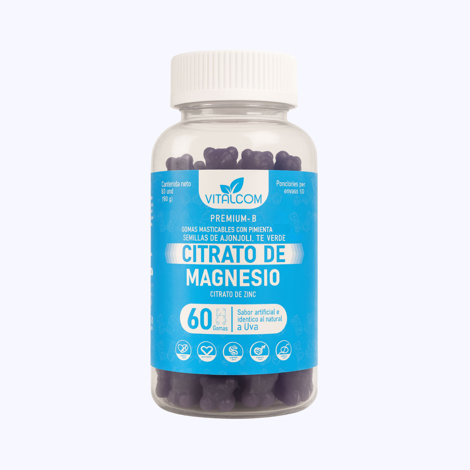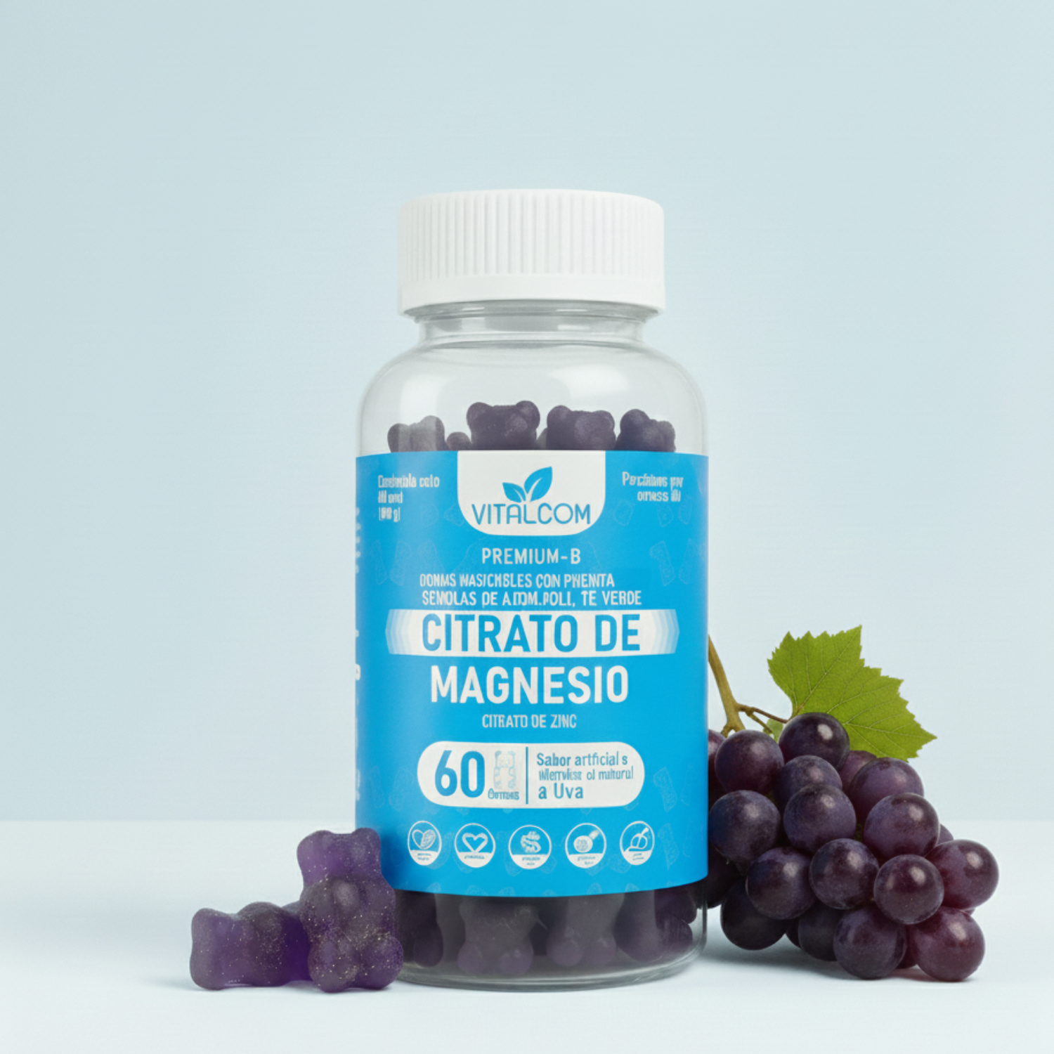 Las gomitas de Citrato de Magnesio Vitalcom combinan magnesio, zinc, pimienta negra, semillas de ajonjolí y té verde en una presentación masticable, deliciosa y práctica. Una fórmula diseñada para apoyar la energía diaria, la salud muscular y ósea, y el bienestar general, con un agradable sabor a uva.